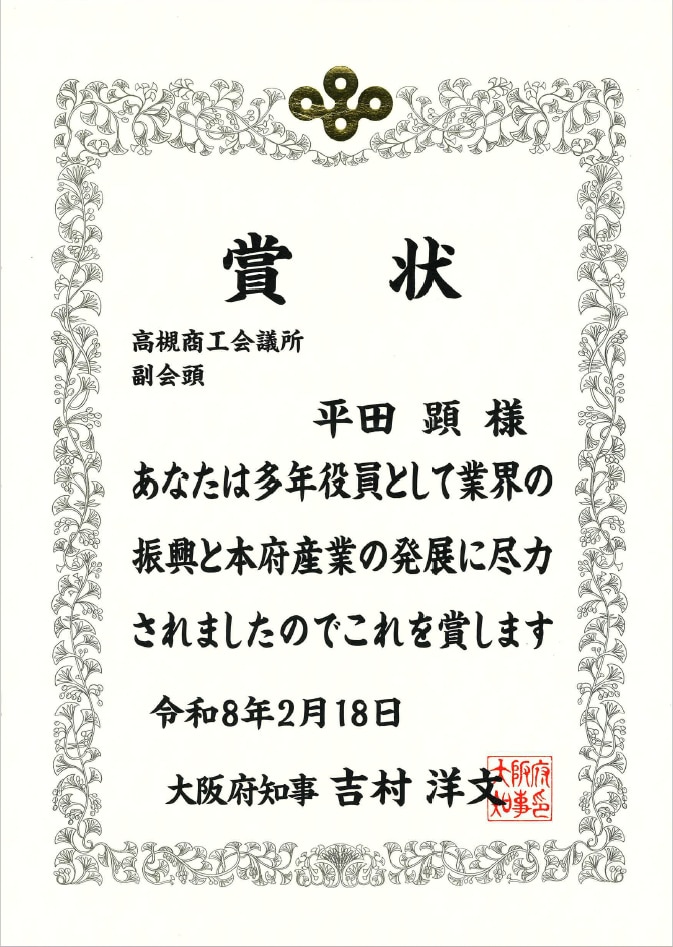 大阪府商工関係者表彰が令和8年2月18日に行われ、「役員、商工会・商工会議所・中央会関係」の部において、高槻商工会議所の副会頭を務める弊社代表・平田 顕が表彰されました。